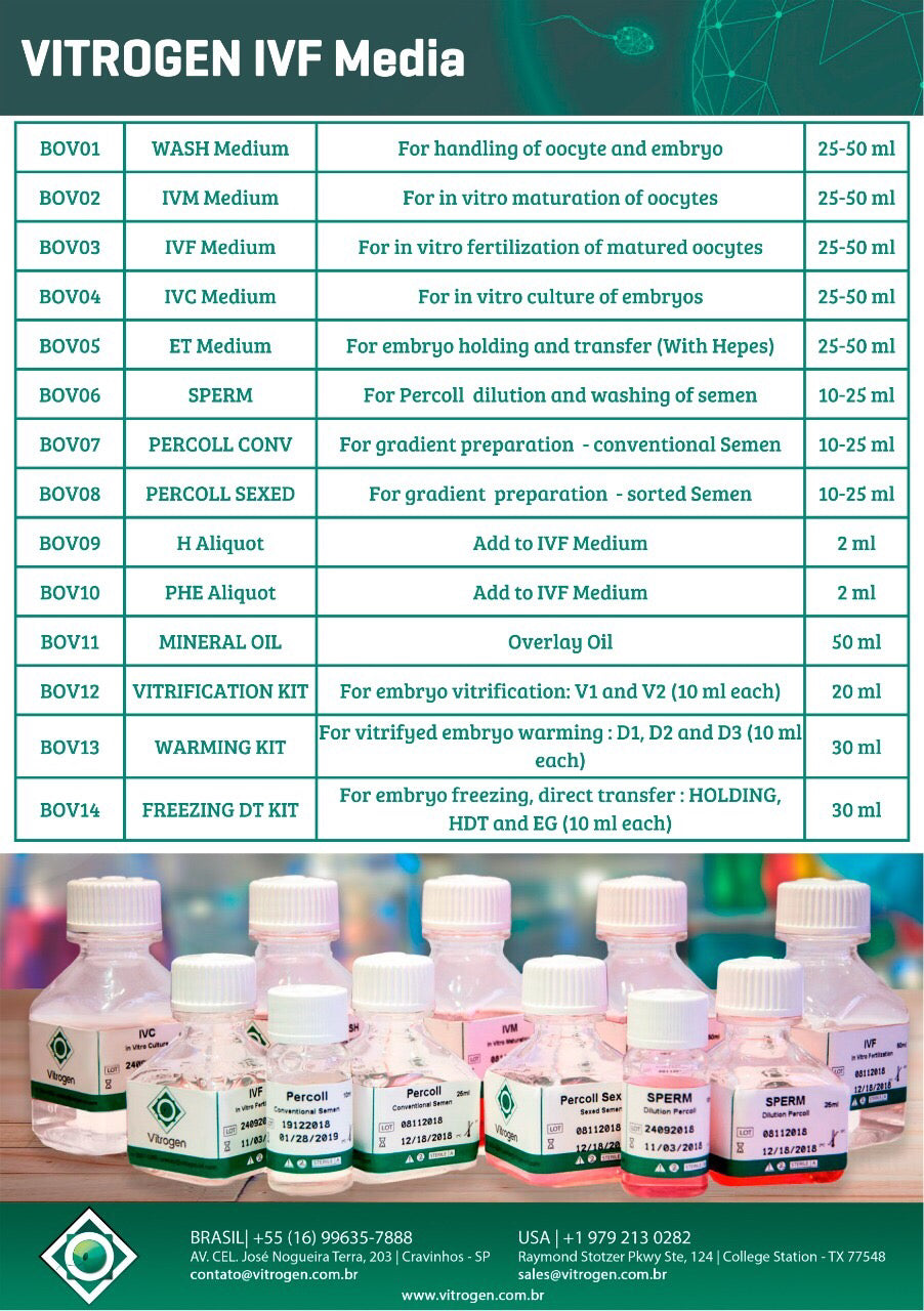 WTA collaborates closely with Vitrogen, a pioneering entity in the realm of Animal Reproduction Biotechnology, renowned for its professionalism, technological prowess, and operational efficiency spanning over two decades in both national and international markets. With an unwavering commitment to research and development, ensures the continuous enhancement of their products and services, aligning seamlessly with cutting-edge techniques.Vitrogen, with a commendable track record, has spearheaded the establishment of over 70 In Vitro Fertilization (IVF) laboratories globally. Our shared mission is to cater to the needs of veterinarians aspiring to establish their laboratories, equipping them with state-of-the-art technology. Additionally, our collaborative efforts aim to assist individuals already entrenched in the field who seek to elevate their businesses through advanced solutions and methodologies. In the pursuit of offering optimal solutions for your laboratories, we are pleased to present our comprehensive catalog below, showcasing the finest Media to meet your needs. Explore the range of products designed to enhance the efficiency and success of your laboratory endeavors.